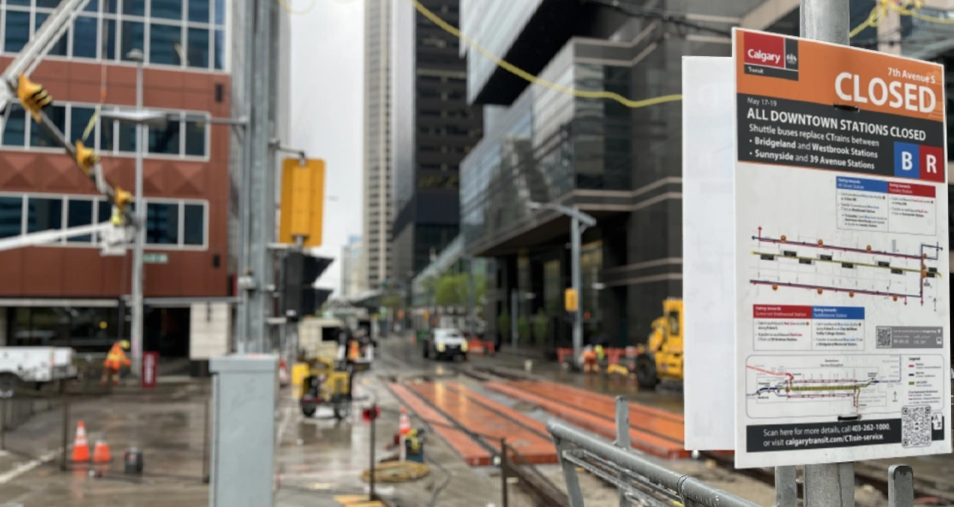 Impacted stations: 8 Street, 7 Street (closed), 6 Street (closed), 4 Street (closed), 3 Street (closed), 1 Street (closed), Centre Street (closed), and City Hall/Bow Valley College stations